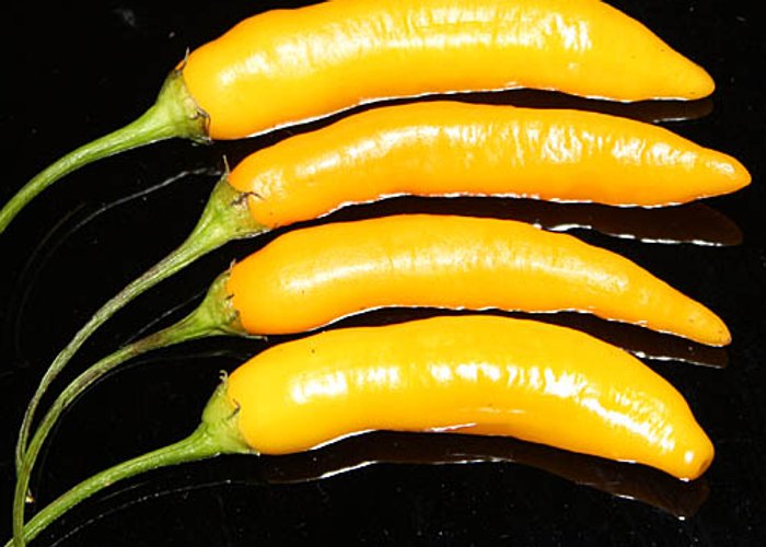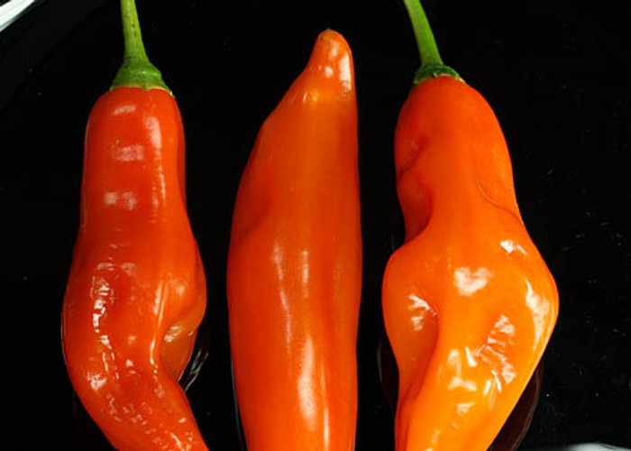 Peru's national pepper. A C. baccatum var. pendulum that ripens to deep orange (amarillo means yellow, but it's really orange). Fundamental to Peruvian cuisine — it's in everything from papa a la huancaína to aji de gallina. Medium heat around 30,000–50,000 SHU. The dried form is called Aji Mirasol. Peru produces tens of thousands of tons annually. Small-podded selection.