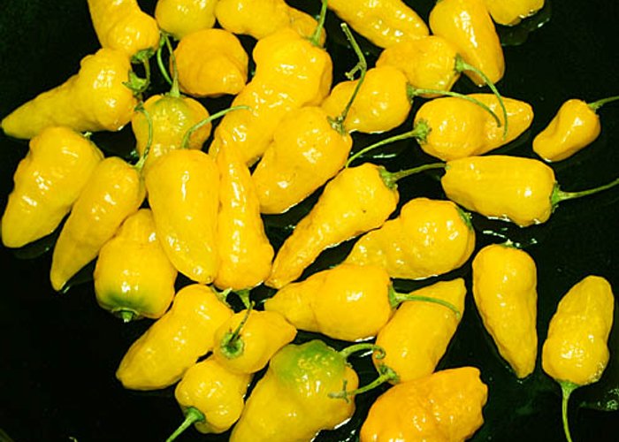 This C. chinense cultivar. Ripens to white/cream, long/tapered pods. Packs 10,000–50,000 SHU (solid heat — enough to make you pay attention). Associated with South America. 'Aji' is the South American word for chile pepper, and most ajis are C. baccatum with fruity, complex flavors.