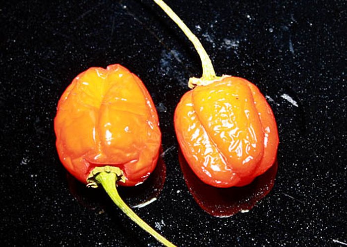 This C. chinense cultivar. Ripens to red, habanero-type pods. Heat sits around 80,000–250,000 SHU — very hot, not for the faint of heart.
