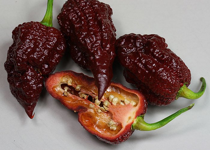 This C. chinense cultivar. Ripens to black, habanero-type pods. Packs 80,000–250,000 SHU (very hot, not for the faint of heart).