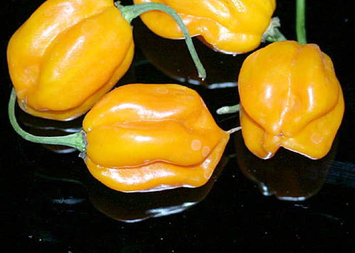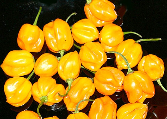 Classified as C. chinense. Ripens to yellow, habanero-type pods. Packs 100,000–325,000 SHU (very hot, not for the faint of heart).