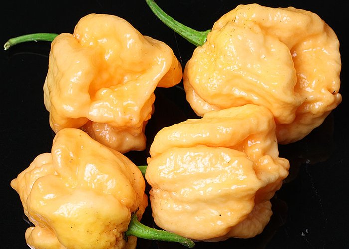 This C. chinense cultivar. Ripens to peach/salmon/pastel, habanero-type pods. Rates 80,000–250,000 SHU, which means very hot, not for the faint of heart.