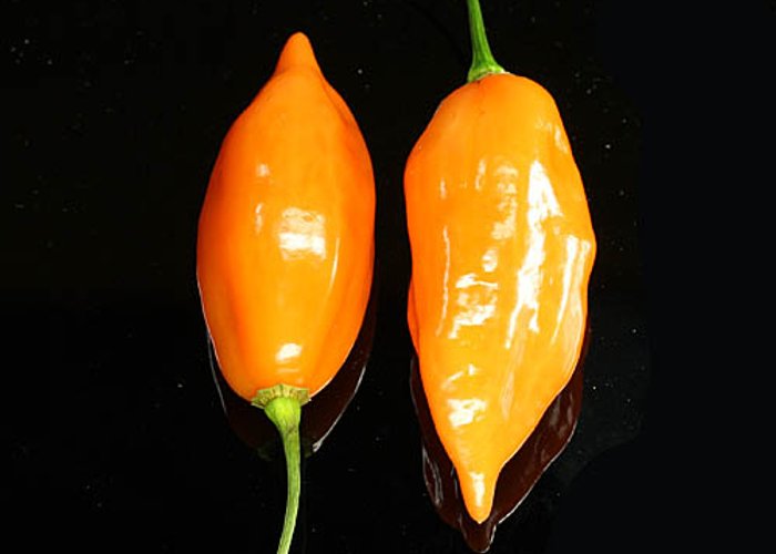 This C. chinense cultivar. Ripens to red, habanero-type pods. Heat sits around 80,000–250,000 SHU — very hot, not for the faint of heart.