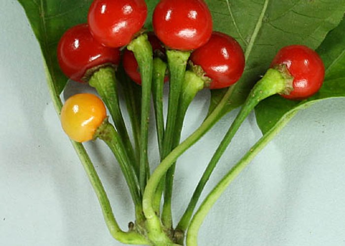 A chinense type. Ripens to red, habanero-type pods. Rates 80,000–250,000 SHU, which means very hot, not for the faint of heart.