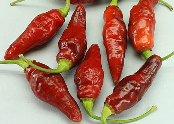 A chinense type. Ripens to red, habanero-type pods. Heat sits around 80,000–250,000 SHU — very hot, not for the faint of heart.