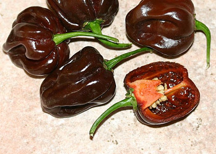A member of the C. chinense group. Ripens to red, habanero-type pods. Clocks in at 80,000–250,000 SHU — very hot, not for the faint of heart.