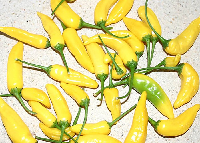 A C. baccatum variety. Ripens to red, long/tapered pods. Clocks in at 10,000–30,000 SHU — solid heat — enough to make you pay attention.