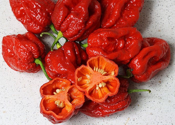 A C. chinense variety. Ripens to red, habanero-type pods. Clocks in at 80,000–250,000 SHU — very hot, not for the faint of heart.