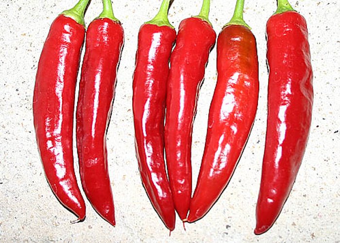A member of the C. annuum group. Ripens to red, standard tapered pods. Rates 2,000–10,000 SHU, which means moderate heat with a noticeable bite.