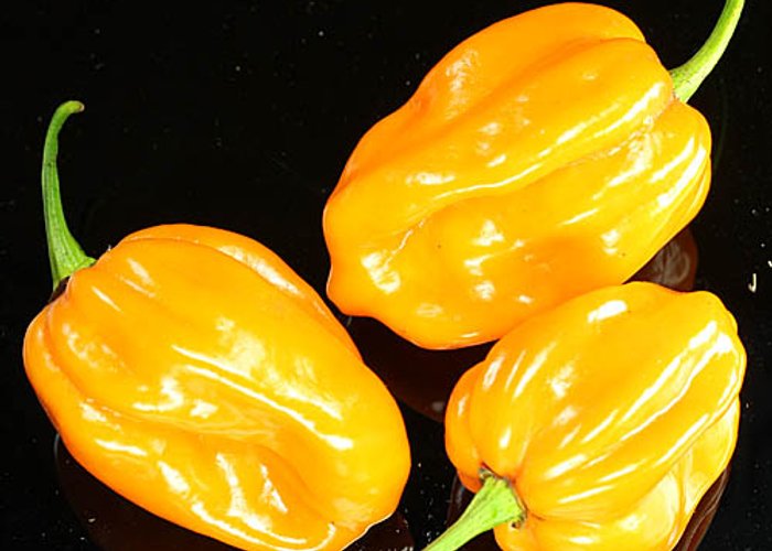 A chinense type. Ripens to red, habanero-type pods. Heat sits around 80,000–250,000 SHU — very hot, not for the faint of heart.