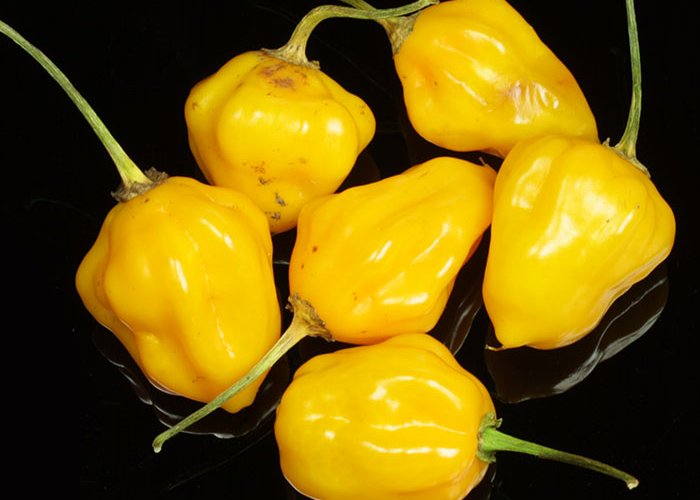 A member of the C. annuum group. Ripens to orange, bell pods. A sweet pepper (0 SHU) — the result of a recessive gene that blocks capsaicin production.