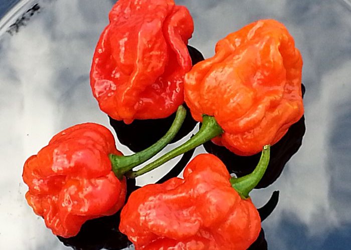 A member of the C. chinense group. Ripens to red, habanero-type pods with wrinkled skin skin. Heat sits around 400,000–1,000,000 SHU — extremely hot, in superhot territory. Associated with Trinidad & Tobago. Part of the large 7 Pot family originating from Trinidad, with dozens of variants bred and selected worldwide.