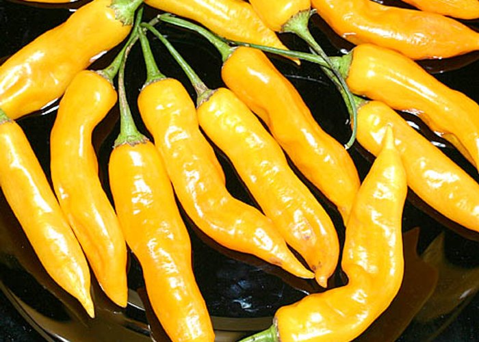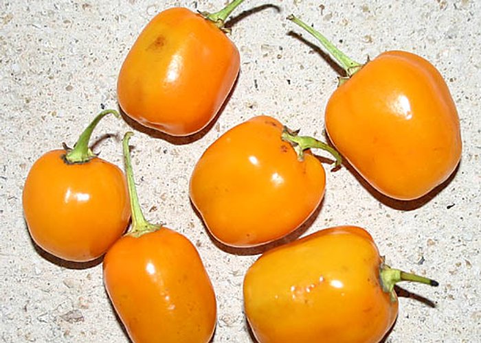 Peru's national pepper. A C. baccatum var. pendulum that ripens to deep orange (amarillo means yellow, but it's really orange). Fundamental to Peruvian cuisine — it's in everything from papa a la huancaína to aji de gallina. Medium heat around 30,000–50,000 SHU. The dried form is called Aji Mirasol. Peru produces tens of thousands of tons annually. Small-podded selection.
