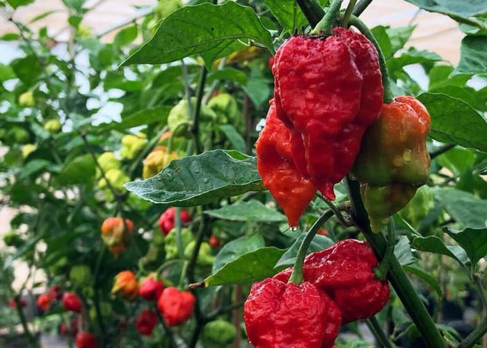 Classified as C. chinense. Ripens to red, habanero-type pods, with warty/bumpy. Rates 500,000–1,400,000 SHU, which means extremely hot, in superhot territory. Roots trace to Trinidad & Tobago.