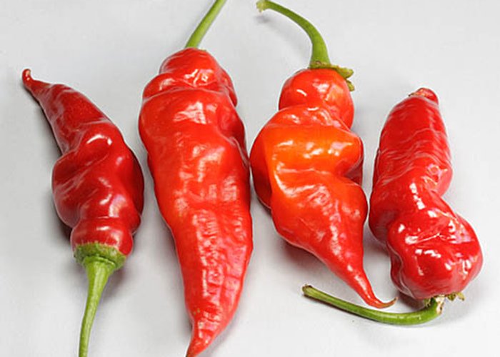 A C. chinense variety. Ripens to red, habanero-type pods. Heat sits around 80,000–250,000 SHU — very hot, not for the faint of heart.