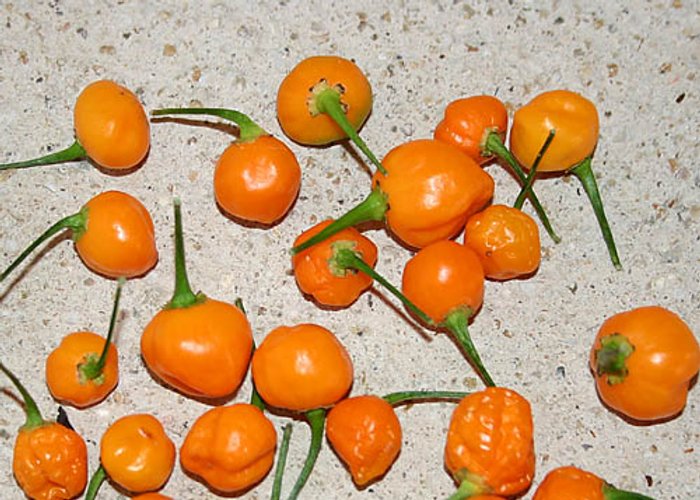 A chinense type. Ripens to red, habanero-type pods. Clocks in at 80,000–250,000 SHU — very hot, not for the faint of heart.