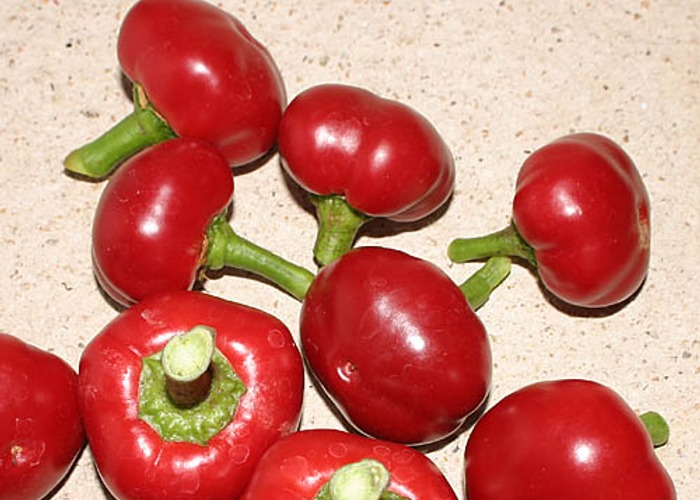 A annuum type. Ripens to red, round/tomato/cherry/marbles pods. Packs 2,500–5,000 SHU (mild heat that most people can handle easily). A cherry pepper, named for the round shape. Often pickled or stuffed.