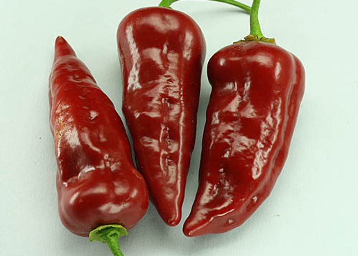 This C. chinense cultivar. Ripens to red, habanero-type pods. Clocks in at 80,000–250,000 SHU — very hot, not for the faint of heart.