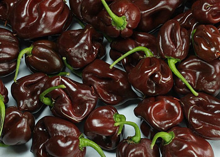 A member of the C. chinense group. Ripens to black, habanero-type pods. Rates 100,000–350,000 SHU, which means very hot, not for the faint of heart. Originates from Yucatán, Mexico. Habanero-type pepper with the characteristic lantern shape and fruity aroma of its species.