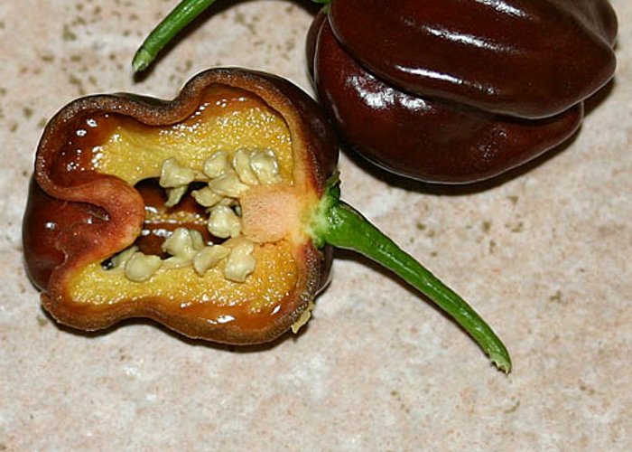 Classified as C. chinense. Ripens to brown/chocolate, habanero-type pods. Heat sits around 100,000–350,000 SHU — very hot, not for the faint of heart. Originates from Yucatán, Mexico. Habanero-type pepper with the characteristic lantern shape and fruity aroma of its species.