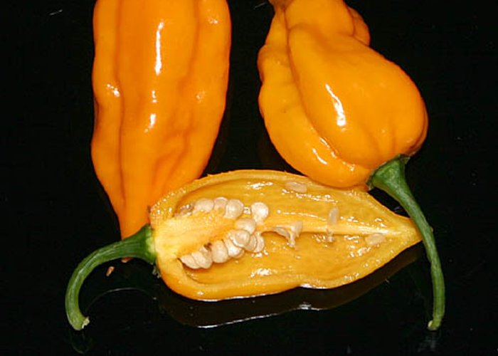 A member of the C. chinense group. Ripens to black, habanero-type pods. Clocks in at 100,000–350,000 SHU — very hot, not for the faint of heart. Roots trace to Yucatán, Mexico. Habanero-type pepper with the characteristic lantern shape and fruity aroma of its species.