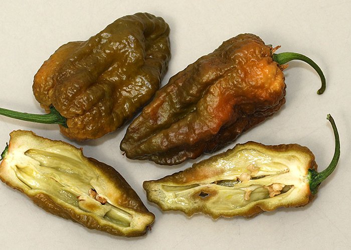 This C. chinense cultivar. Ripens to brown/chocolate, habanero-type pods, with warty/bumpy. Rates 400,000–850,000 SHU, which means extremely hot, in superhot territory. Originates from India / Bangladesh. Parentage: C. chinense × C. frutescens. Ghost-type peppers trace back to the landraces of Assam and Nagaland in Northeast India.