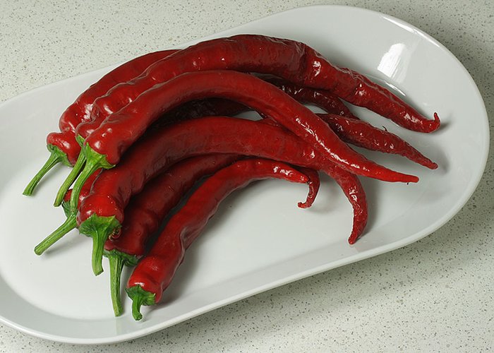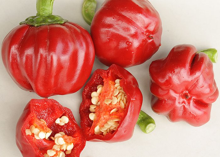 A annuum type. Ripens to red, standard tapered pods. Packs 500–1,000 SHU (very mild, barely any heat).
