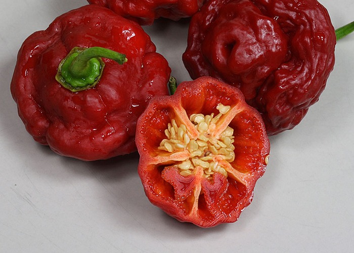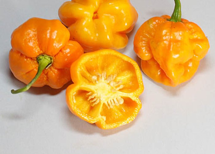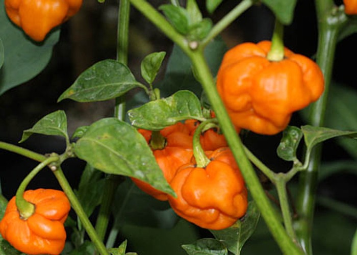 A member of the C. chinense group. Ripens to red, mushroom/bonnet pods. Clocks in at 100,000–350,000 SHU — very hot, not for the faint of heart. Roots trace to Jamaica / Caribbean.
